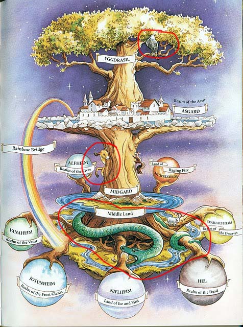 Y por último queda Níðhöggr, un dragón que habita las raíces del árbol en Niflheim. Parece más una serpiente que un dragón y de hecho su cuerpo es ondulado y se puede retorcer fácilmente. Esta criatura está royendo permanentemente las raíces del Yggdrasil, las cuales le retienen del resto de los mundos.