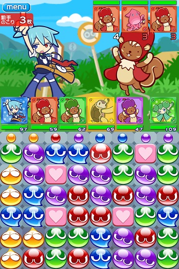 Esto de aquí arriba es Puyo Puyo Quest, el juego original en su versión japonesa, la única que va a haber visto lo visto. Pero por lo que parece en occidente no pegan los personajes de toda la vida y hay que cambiarlos por una mierda de caramelos y comida, vistos hasta la saciedad, pero que es lo que se lleva aquí. Pero como veis el resto es exactamente igual, porque esto no es más que un reskin.